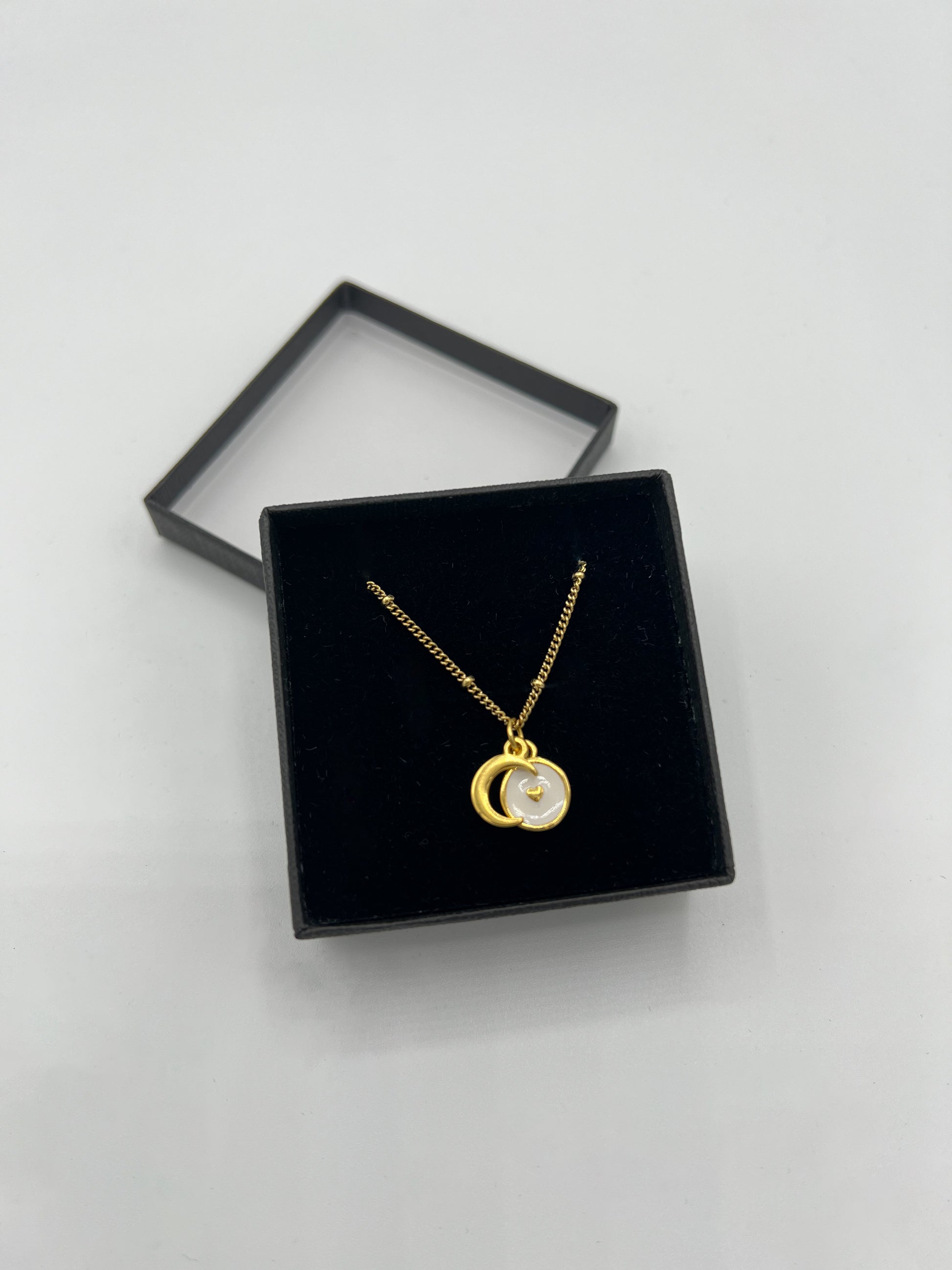 - Un collier Lune. Délicatesse et rêverie autour du cou! Craquez pour sa chaine boule et son médaillon cœur réhaussé d'une lune. Maille en acier, médaillon et pampille en plaqué or, on évitera donc les parfums et les liquides sur ces derniers.